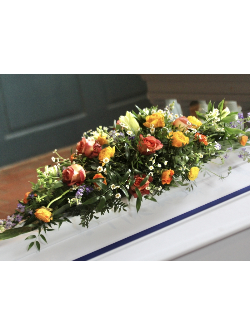Orange spring coffin arrangement